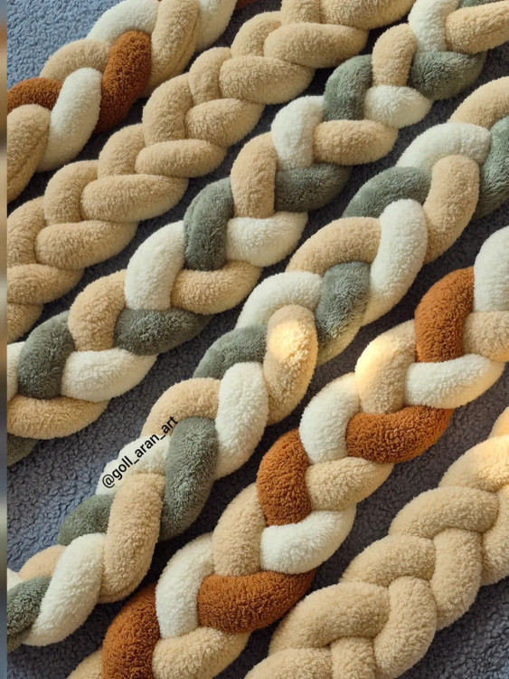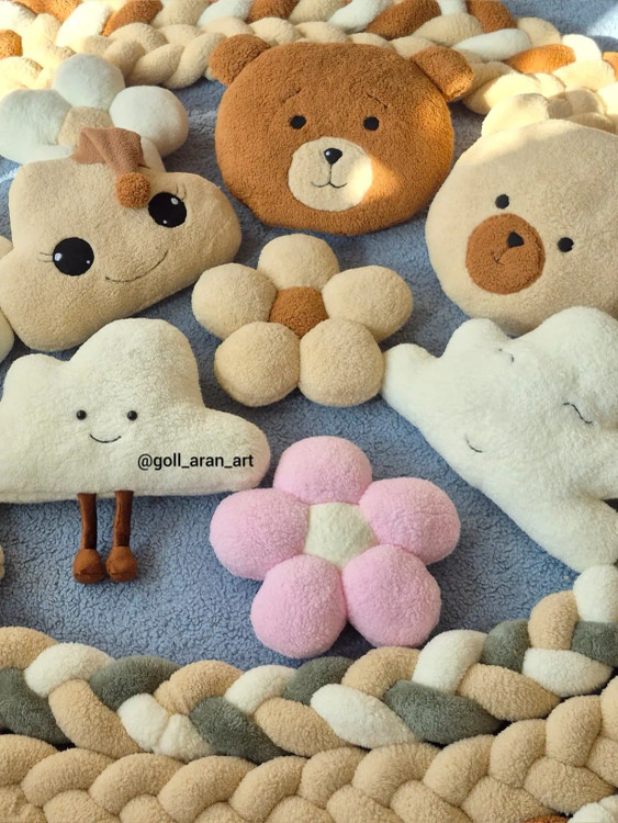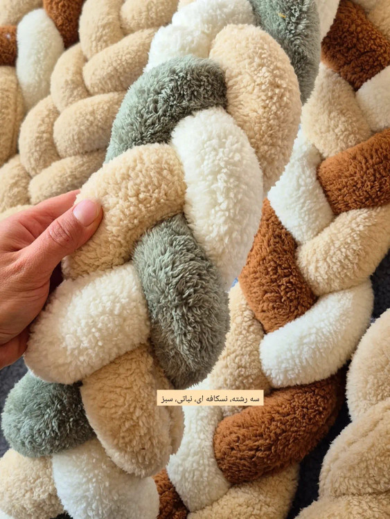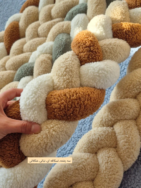 فرشینه خرسی نسکافه ای با قطر ۱۲۰ سانتیمتر و کوسنهای تزئینی در رنگهای متنوع.